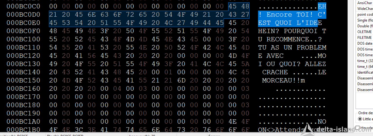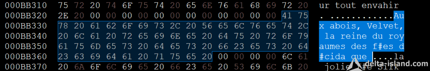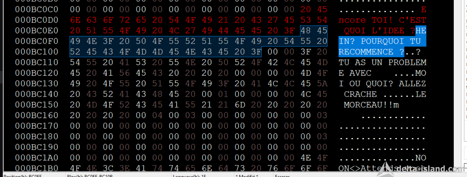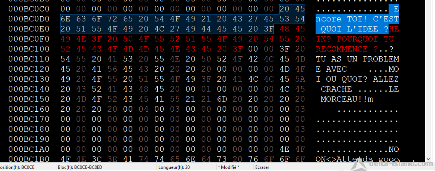 La sélection réalisé fait 20 hexadécimal, Le jeu tout les 20 Hexadécimal va a la ligne automatiquement. Donc l'idée pour ne pas avoir un mot coupé. Il faut simuler le jeu ( Son comportement ).corrigo a écrit : mar. 14 avr. 2026 16:41J'ai jamais pigé ces trucs de pointeurs dans les ROMS, même là ça reste du chinois pour moikitchen34 a écrit : lun. 13 avr. 2026 12:46C'est vraiment pas compliqué. Tout les jeux fonctionnent pareil. T'a le pointage de texte, et l'arrêt de lecture. Pour celui ci l'arret est un 00. Et il passera au prochain texte.Tatsupicchu a écrit : lun. 13 avr. 2026 01:03 D'accord, je vais corriger ça . Après je t'avoues que j'apprends sur le tas , j'ai quasi aucune notion de programmation, a part un tout petit peu dans les années 90 en qbasic, j'avais fait un mastermind , et j'avais commencé quelques animations pour un embryon de jeu de plateforme![]()