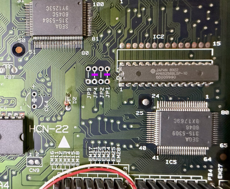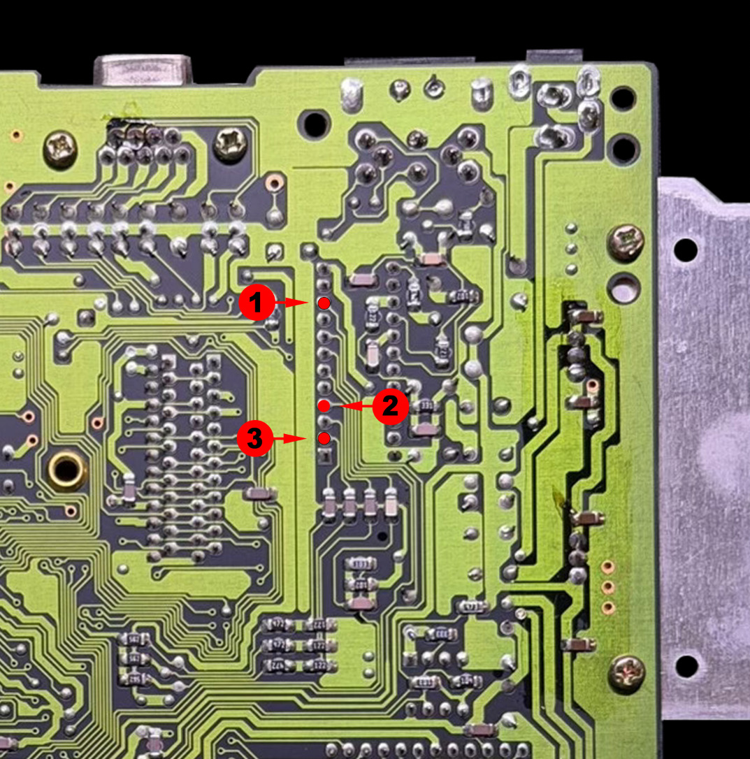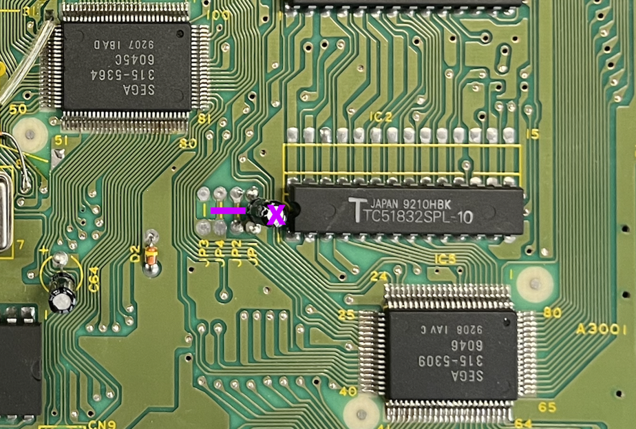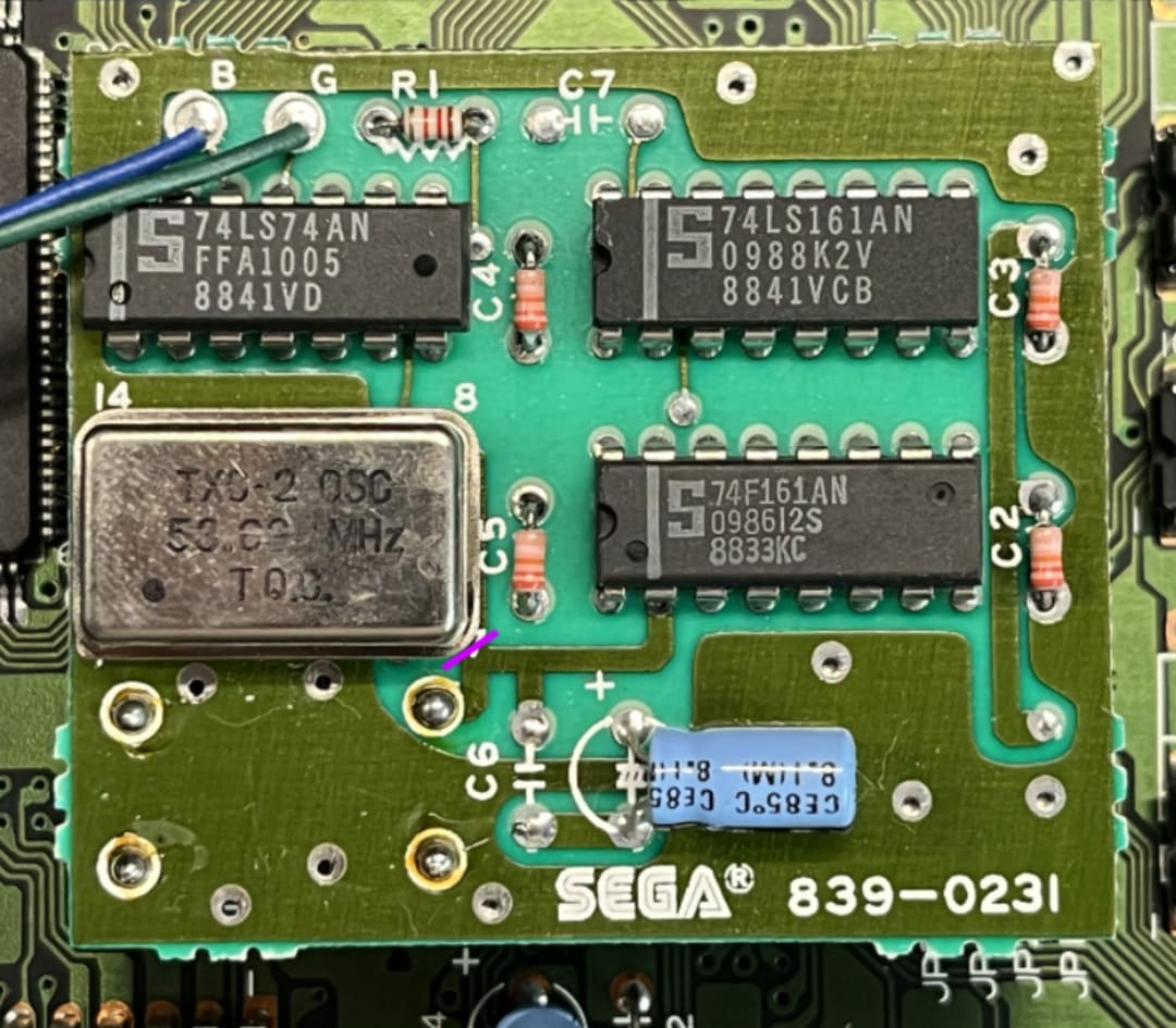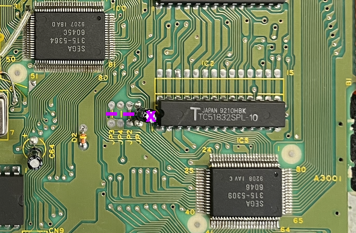 Lorsque vous utilisez un adaptateur RVB PAL FRA modifié sur une console NTSC (JPN ou USA), le signal vidéo n’est pas entièrement compatible. Même après modification classique (coupure de piste + bypass de synchronisation PAL), il peut rester un conflit empêchant l’affichage correct de la barre de couleur.