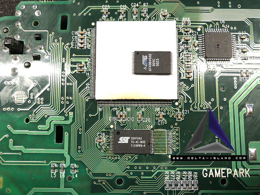 En retournant la carte mère de votre GP32, vous découvrirez la mémoire flash AT49BV040 qui est défaillante.